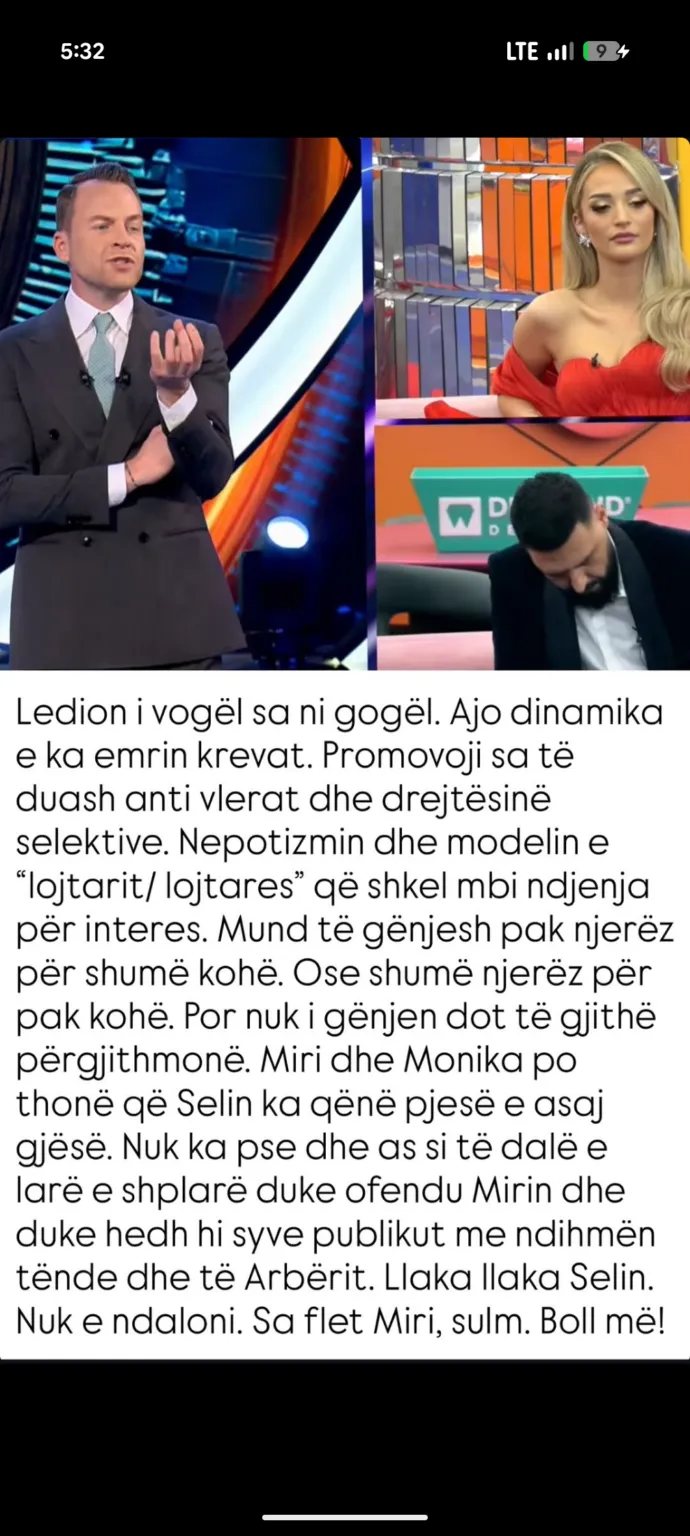 Në njërin prej postimeve, ai ka ironizuar drejtpërdrejt moderatorin duke e quajtur “Ledion i vogël sa ni gogël”, teksa ka akuzuar formatin se promovon antivlera, drejtësi selektive dhe nepotizëm.