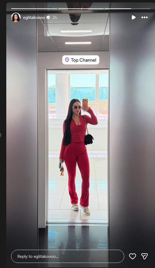 Në Instastory ndau një selfie nga lifti ku zbuloi lokacionin ku gjendet.