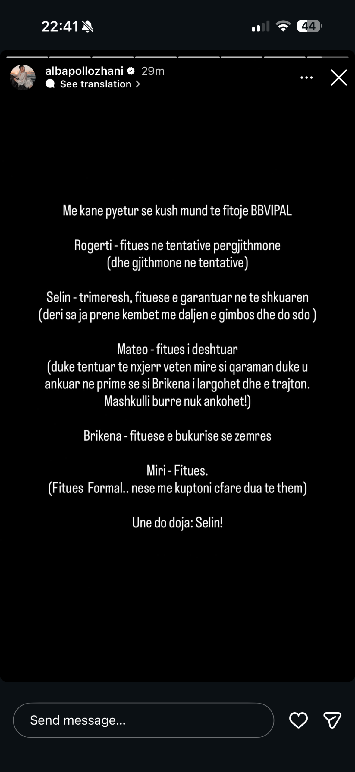 Vetëm një javë na ndan nga finalja e madhe e “Big Brother VIP Albania” dhe ethet e garës nuk po i ndiejnë vetëm banorët apo ndjekësit besnikë, por edhe figurat e tjera publike e ish-banorët. Së fundmi, Alba Pollozhani, ish-banorja e sezonit të katërt të “Big Brother VIP Kosova”, ka vendosur të ndajë analizën e saj mbi pretendentët e çmimit të madh. Përmes një postimi në llogarinë e saj në Instagram, ajo u është përgjigjur pyetjeve të ndjekësve duke bërë një përshkrim të shkurtër por mjaft thelbësor për secilin prej protagonistëve të mbetur, pa i kursyer mendimet e drejtpërdrejta dhe ironinë.