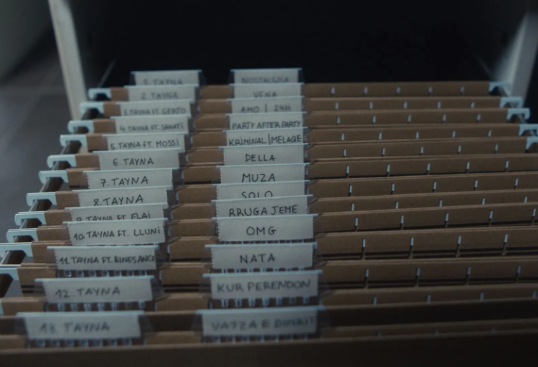 Megjithatë, pjesa më intriguese vjen nga një tjetër skenë: një sirtar i mbushur me dosje që duken fiks si një listë këngësh.