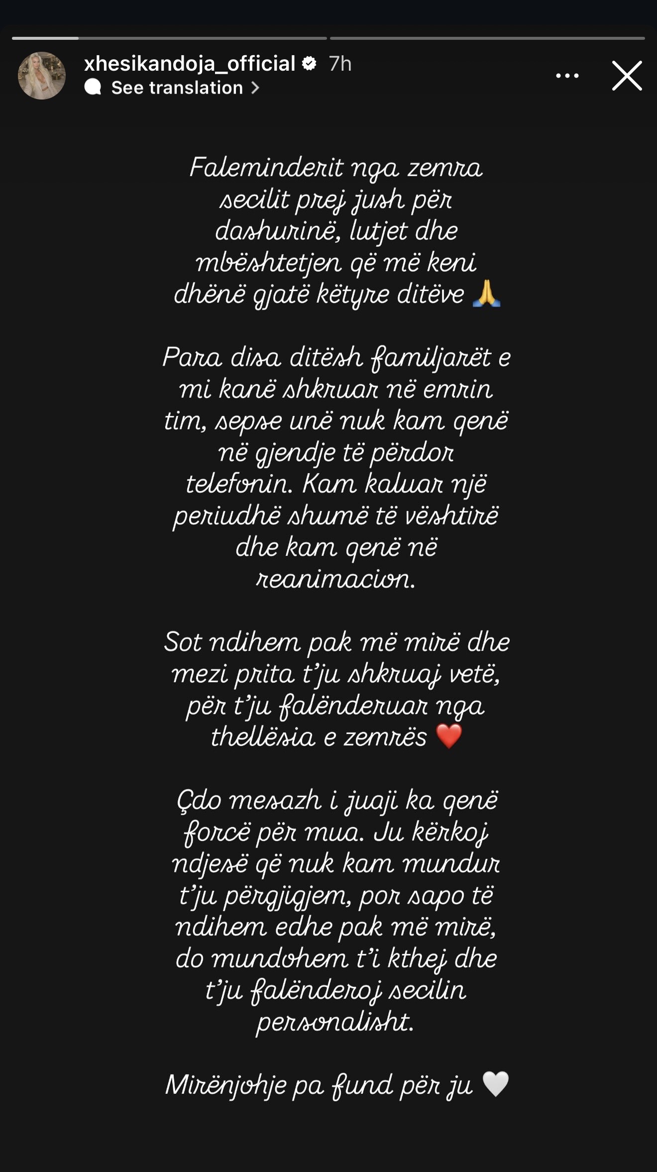 “Para disa ditësh familjarët e mi kanë shkruar në emrin tim, sepse unë nuk kam qenë në gjendje të përdor telefonin. Kam kaluar një periudhë shumë të vështirë dhe kam qenë në reanimacion,” shkruan këngëtarja në postimin e saj.