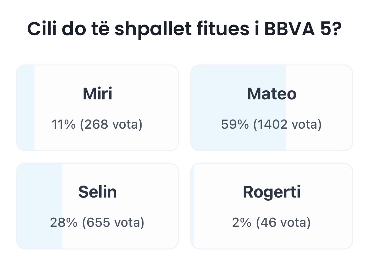 Bazuar në këto rezultate, deri në këto momente Mateo shihet si kandidati kryesor për të fituar Big Brother VIP Albania sonte.