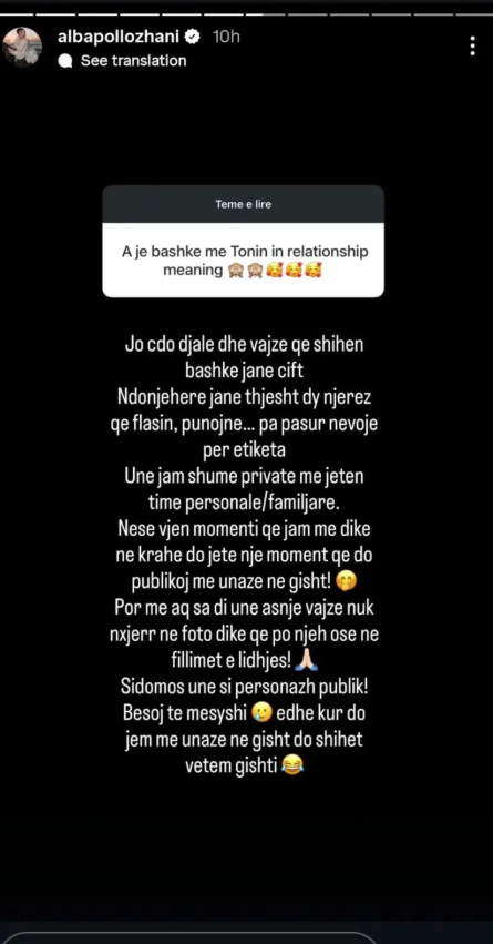 Përmes një bashkëbisedimi me ndjekësit në Instagram, Alba është pyetur drejtpërdrejt nëse mes saj dhe Toneyt ka diçka më shumë sesa shoqëri.