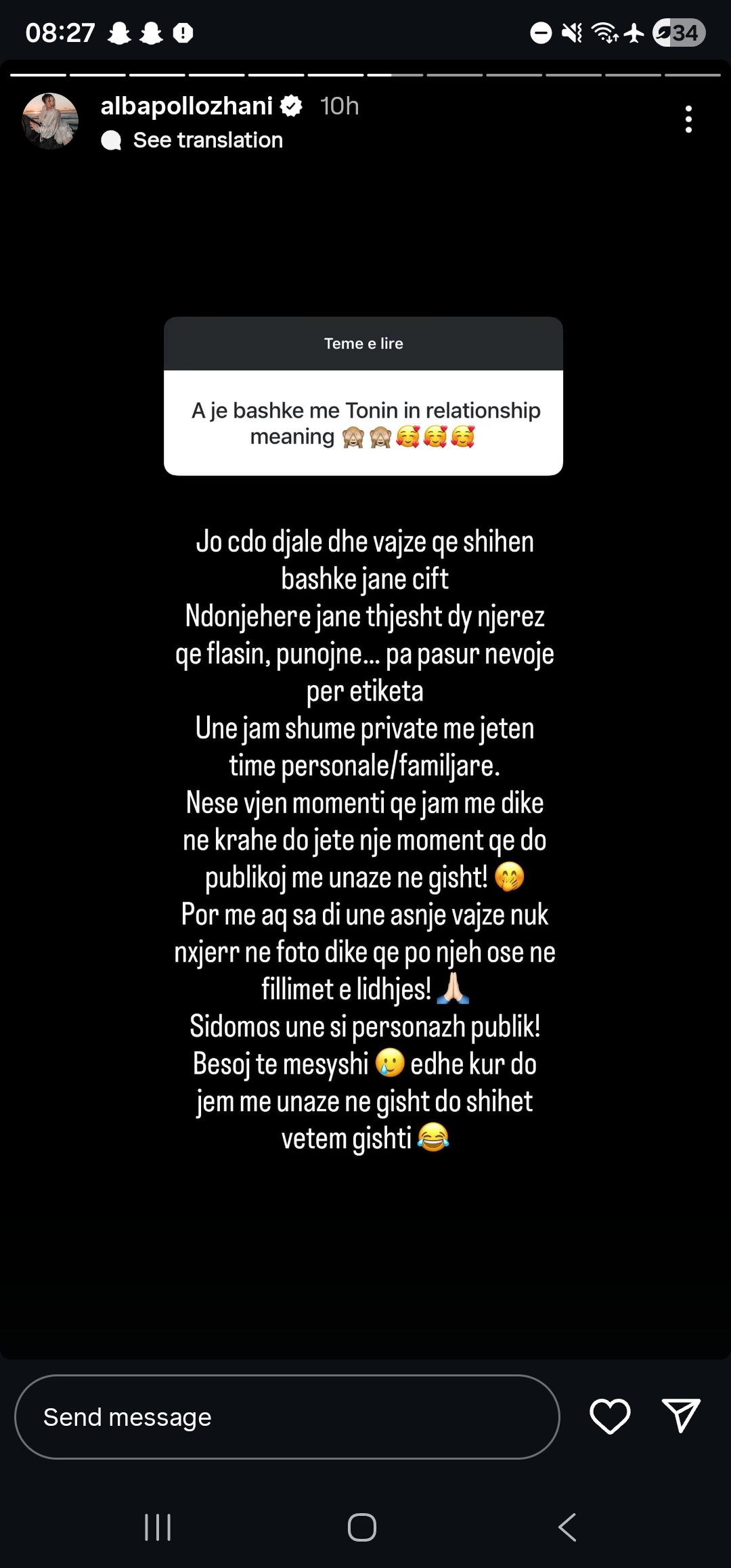 ​Më tej, ish-konkurrentja e BBVK 4 ka sqaruar se është një natyrë shumë private kur bëhet fjalë për jetën e saj personale dhe familjare. Alba theksoi se kur të vijë momenti i duhur, lajmin e madh do ta japë vetë.