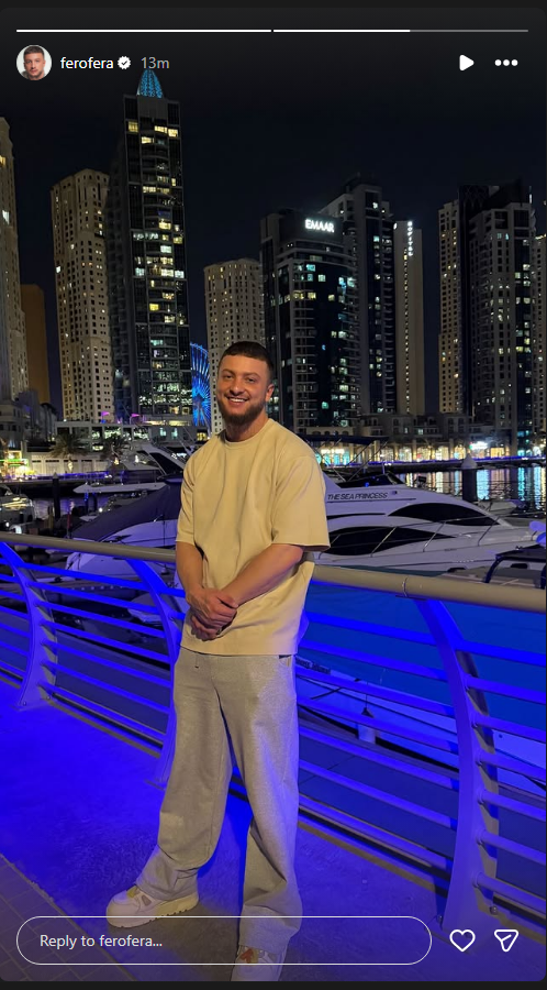 Reperi Fero ka ndarë një Instastory nga Dubai, ku shfaqet i buzëqeshur pranë jahteve luksoze dhe ndërtesave moderne të qytetit.